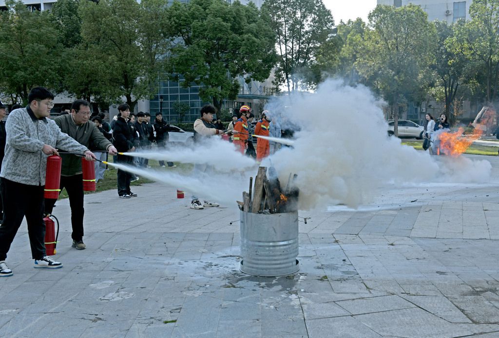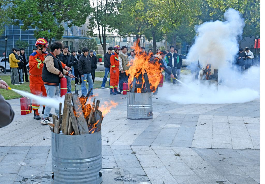 2025年11月4日,安徽淮南,淮南职业技术学院学生在消防救援人员指导下学习使用灭火器。