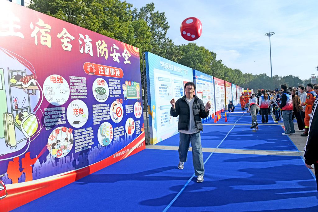 2025年11月4日,安徽淮南,淮南职业技术学院学生通过互动游戏学习消防安全知识。