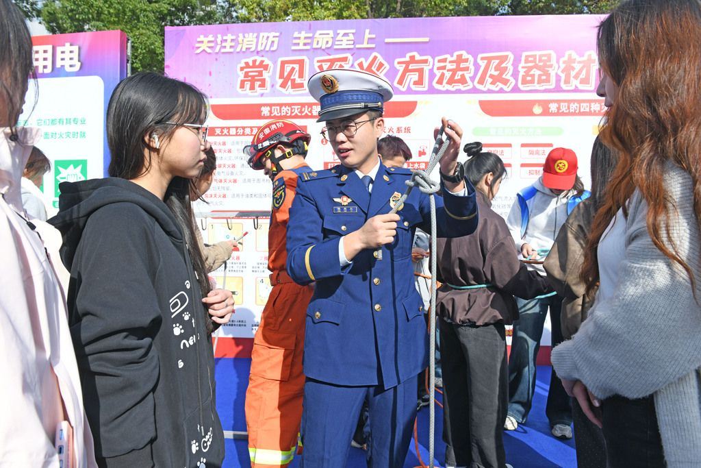 2025年11月4日,安徽淮南,消防救援人员在消防宣传月活动现场向学生讲解救生绳打结方法。
