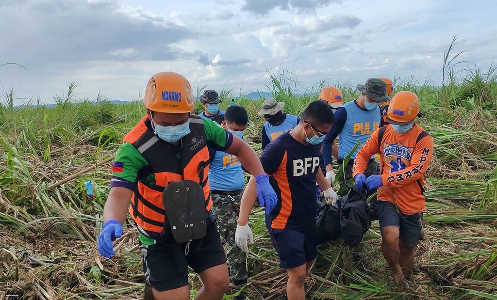 当地时间2025年11月6日,菲律宾,消防人员在甘蔗种植园中搬运台风“海鸥”遇难者的遗体。台风“海鸥”在菲律宾中部地区引发洪灾,造成至少140人死亡,另有127人失踪。