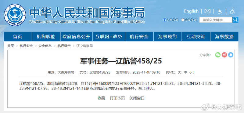 据中国海事局网站消息,大连海事局发布航行警告,11月9日16时至23日16时,渤海海峡黄海北部部分海域执行军事任务,禁止驶入。