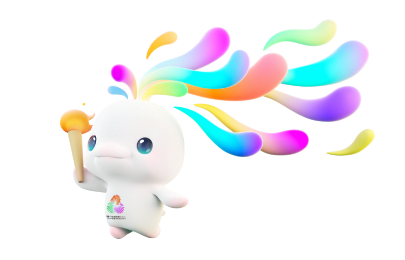 这两只萌物的头顶可不是“鸡冠”,而是三色浪花,融合了广东木棉红、香港紫荆紫和澳门莲花绿,分别代表广东、香港、澳门三个联合承办本届赛事的地区。从正面看,这三色浪花还构成了一颗爱心的形状❤️,寓意着三地同心;而为海豚添上手和脚,是为了更好表现运动姿态与动态美感。