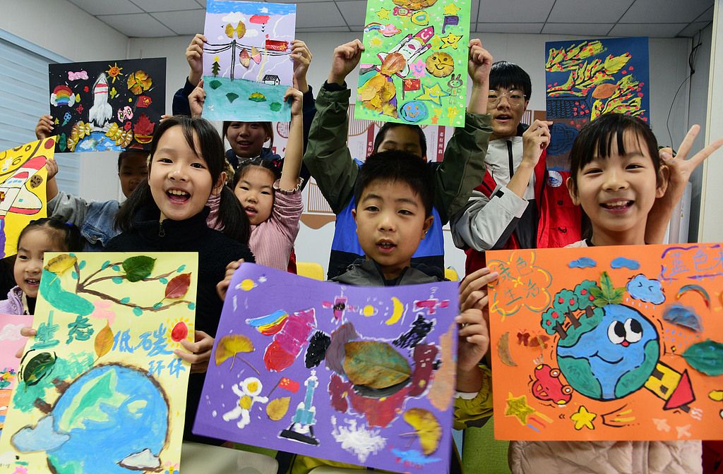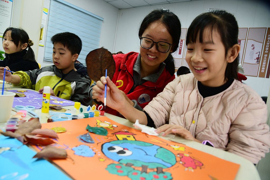 江苏镇江:小朋友用落叶拼贴制作创意画