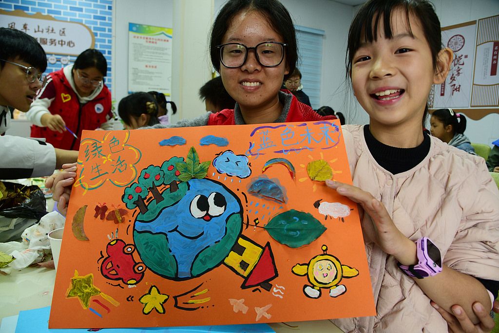 2025年11月9日,江苏镇江,一名小朋友展示用落叶拼贴的创意画。