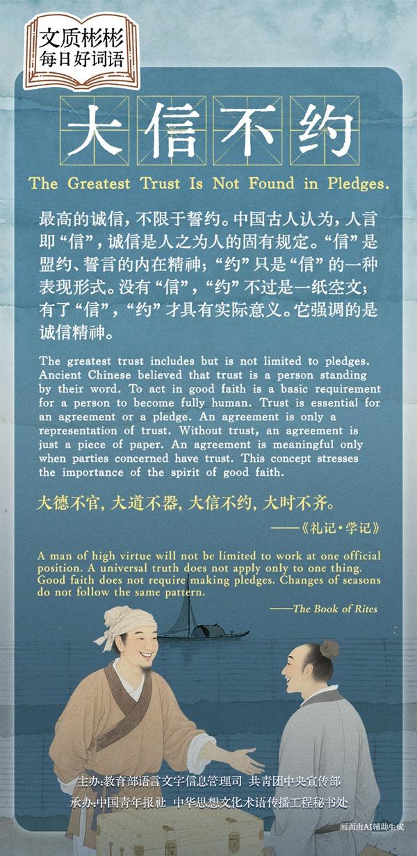 The greatest trust includes but is not limited to pledges. Ancient Chinese believed that trust is a person standing by their word. To act in good faith is a basic requirement for a person to become fully human. Trust is essential for an agreement or a pledge. An agreement is only a representation of trust. Without trust, an agreement is just a piece of paper. An agreement is meaningful only when parties concerned have trust. This concept stresses the importance of the spirit of good faith.