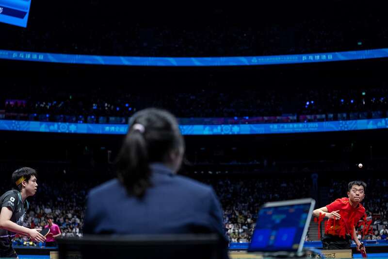 11月16日,澳门,第十五届全国运动会乒乓球男子单打铜牌赛,北京队选手王楚钦(左)4比1战胜辽宁队选手袁励岑,夺得铜牌。中青报·中青网记者 李隽辉/摄