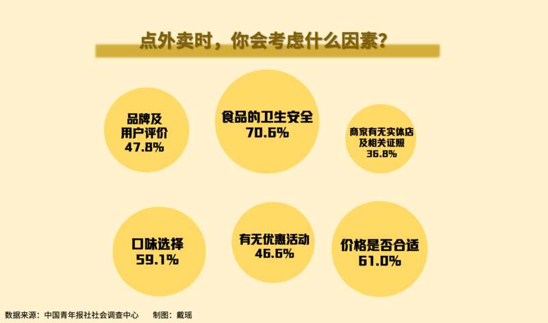 点外卖时,你会考虑什么因素?数据显示,70.6%的受访者会关注食品的卫生安全,61.0%的受访者会判断价格是否合适,59.1%的受访者会考虑口味选择。另外,品牌及用户评价(47.8%),有无优惠活动(46.6%),商家有无实体店及相关证照(36.8%),配送距离及时长(31.7%),有无标识盐、酱油等调味剂不含碘(25.9%),是否添加了蚝油、鸡精提鲜(19.3%)等也是受访者会考虑的因素。