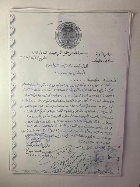 2018年12月31日,伊拉克鲁萨法区小学退休校长古松·希亚写给伊拉克当地政府请求修建学校的手写信。采访者供图