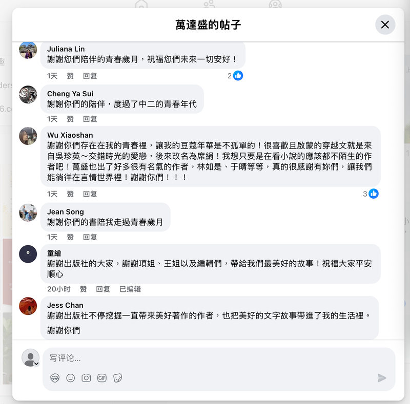 无论如何,言情小说陪伴了一代人的青春和成长。想当年,万盛与狗屋/果树(林白出版社)、禾马、龙吟等出版方共同创造了台湾言情小说的“黄金时代”。然而出版环境和生态在变化,阅读习惯和偏好也在变化,一代人的青春记忆注定会被封装,会被凝结。但就像那封告别信中说的,爱与文字不会消失,总会在我们的生命中以另一种形式继续发光。