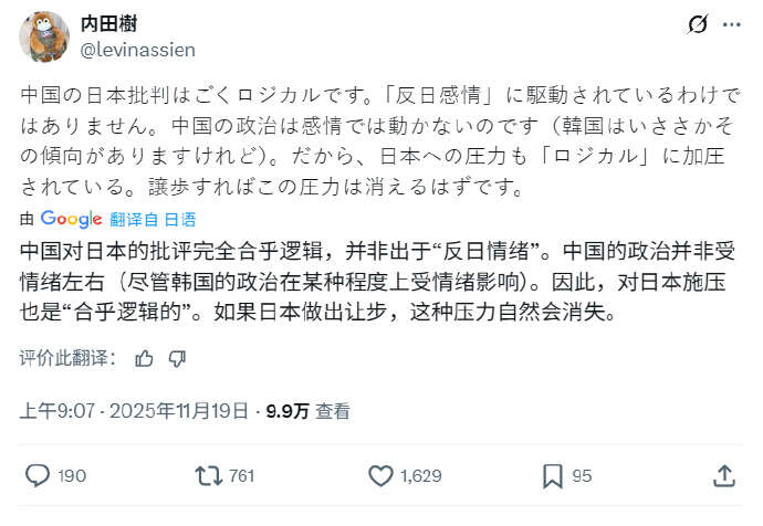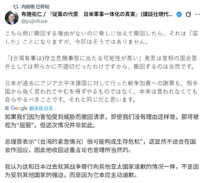 内田树关注到,日本政府目前并无道歉和撤回言论的姿态。他认为,高市发表了不当言论,收回这一言论理所当然;就像对二战历史罪行一样,本就应主动道歉。