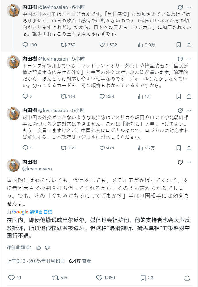 “看看吧,看看高市在这么短的时间内对国家利益的伤害有多大。她完全应该下台。”日本学者内田树在社交平台上写道。他表示,中国对日本的批评完全合乎逻辑,并非出于“反日情绪”。