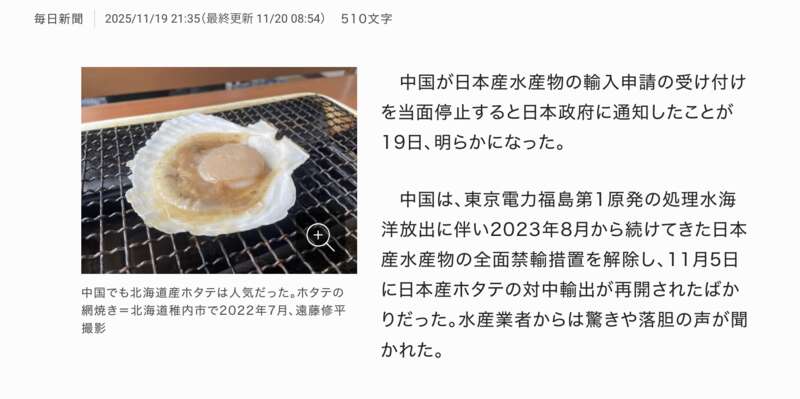 据共同社、日本放送协会和《朝日新闻》报等日媒报道,11月19日,中国向日方通报暂停进口日本水产品。日媒分析称,中方此举或是针对日本首相高市早苗涉台错误言论的反制措施。