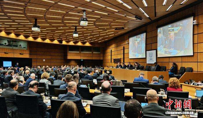 当地时间11月20日,国际原子能机构理事会表决通过美国与英国、法国、德国共同推动的伊朗核问题决议。中国常驻国际原子能机构代表李松发言阐述中方立场。图为会议现场。中国常驻维也纳代表团 供图