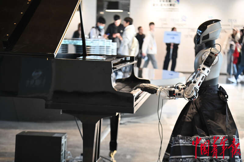 “魔搭社区”(杭州)开发者中心的人形机器人钢琴演奏。 中青报·中青网记者 李剑平/摄