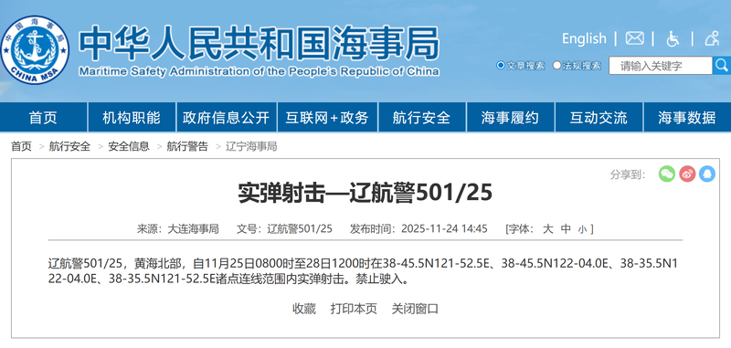 据中国海事局网站消息,大连海事局发布航行警告,11月25日8时至28日12时,黄海北部部分海域实弹射击,禁止驶入。