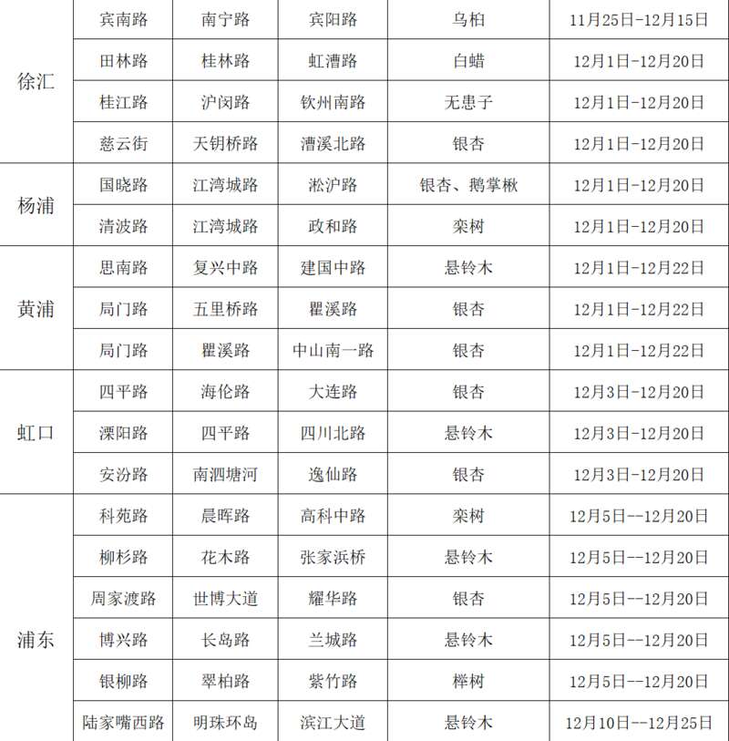上海部分区域“落叶不扫”推荐点位及观赏时间。上海市绿容局供图