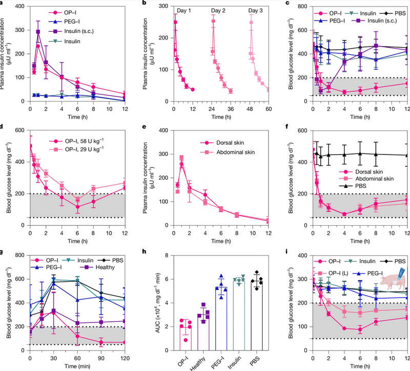 中国青年报客户端讯(中青报·中青网记者 李剑平)近日,由浙江大学牵头在《自然》发表的《A skin-permeable polymer for non-invasive transdermal insulin delivery》研究成果,第一次提出通过一种皮肤渗透性高分子——聚[2-(N-氧化物-N,N-二甲基氨基)乙基甲基丙烯酸酯](简称OP),成功实现胰岛素无创透皮给药。其胰岛素键合物(OP-I)在糖尿病动物模型中,表现出与皮下注射胰岛素相当的降糖疗效。