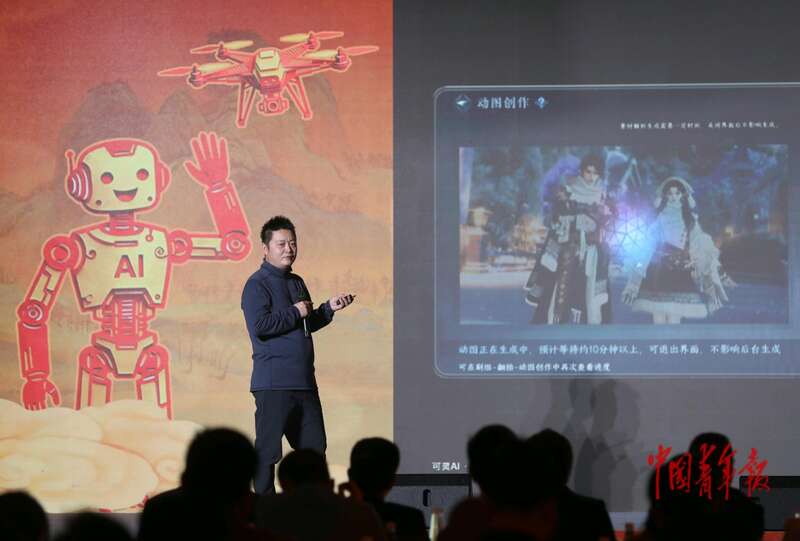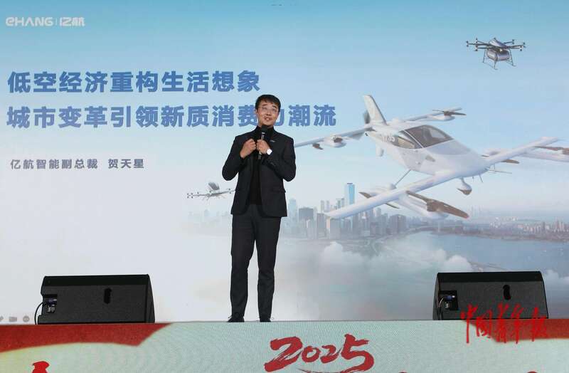 11月26日,北京,2025青年国潮品牌共创大会会场,亿航智能集团副总裁贺天星在演讲中。中青报·中青网记者 陈剑/摄