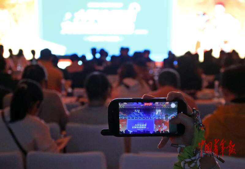 11月26日,北京,2025青年国潮品牌共创大会会场,一位参会嘉宾用手机拍摄大屏幕里播放的“大学生国潮文体生活报告”。中青报·中青网记者 陈剑/摄