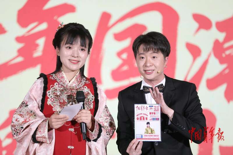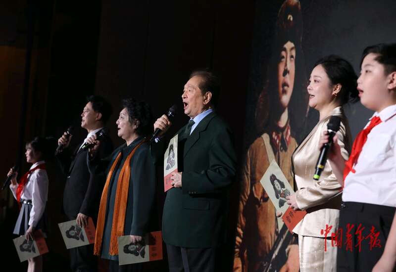 11月26日,北京,2025青年国潮品牌共创大会会场,现场启动同颂中华·全国青少年志愿文学创作与诵读大赛,艺术家瞿弦和(左四)、张筠英(左三)领诵《雷锋之歌》。中青报·中青网记者 陈剑/摄