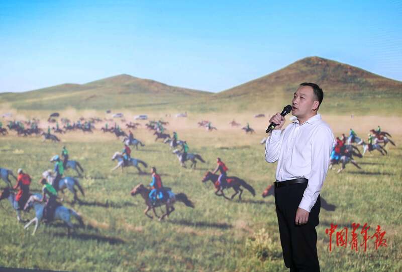 11月26日,北京,2025青年国潮品牌共创大会会场,内蒙古自治区锡林郭勒盟文体旅游广电局副局长邢海鹏在演讲中。中青报·中青网记者 陈剑/摄