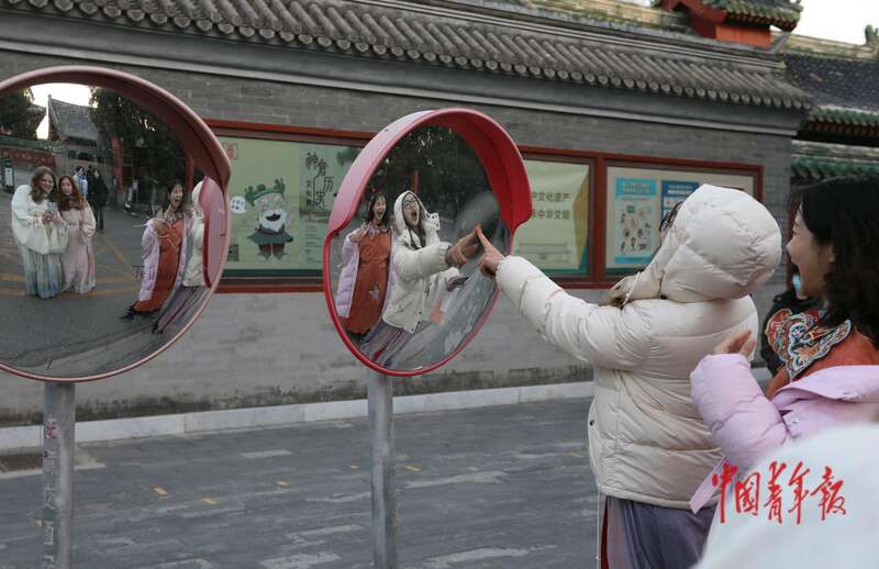 11月25日,在位于北京先农坛的北京古代建筑博物馆,中外学子在交通反光凸镜前拍照。中青报·中青网记者 陈剑/摄