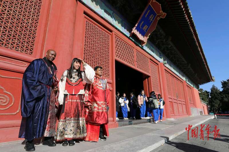 11月25日,在位于北京先农坛的北京古代建筑博物馆,中外学子在拜殿前合影留念。中青报·中青网记者 陈剑/摄