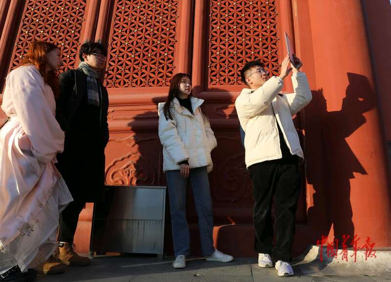 11月25日,在位于北京先农坛的北京古代建筑博物馆,一位留学生在夕阳的余晖下拍照。中青报·中青网记者 陈剑/摄