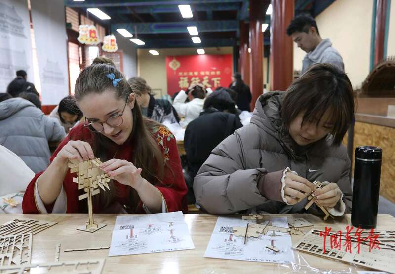 11月25日,在位于北京先农坛的北京古代建筑博物馆,来自法国的留学生塞莱斯特(左)和大家一起制作“佛光寺柱头铺作”的手工。中青报·中青网记者 陈剑/摄