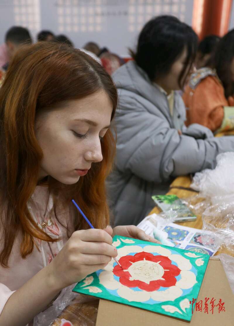 11月25日,在位于北京先农坛的北京古代建筑博物馆,来自白俄罗斯的留学生卡捷琳娜,正在对“敦煌三兔藻井”图案进行涂色。中青报·中青网记者 陈剑/摄