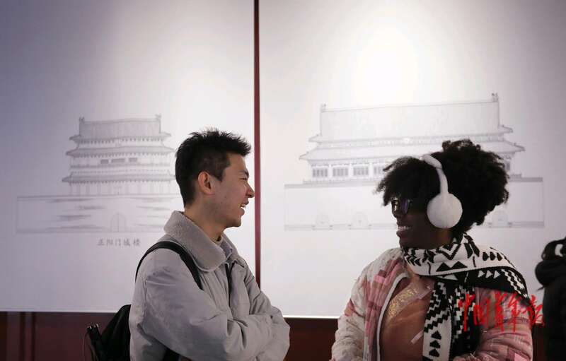 11月25日,在位于北京先农坛的北京古代建筑博物馆,来自中国(左)和美国的学子在研学活动中交流。据介绍,该活动由清华大学研究生会、清华大学国际学生学者中心与北京市文博发展中心联合举办,主题为“WETrip·先农坛·古建之美”。活动以“学生组织、学生讲述、学生实践”为主,中外学子沉浸式探索与体验中华传统文化。中青报·中青网记者 陈剑/摄