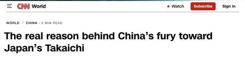美国有线电视新闻网刊发报道《中国对日本高市早苗愤怒背后的真正原因》,分析了中方立场及严正回应的正当性和合理性。