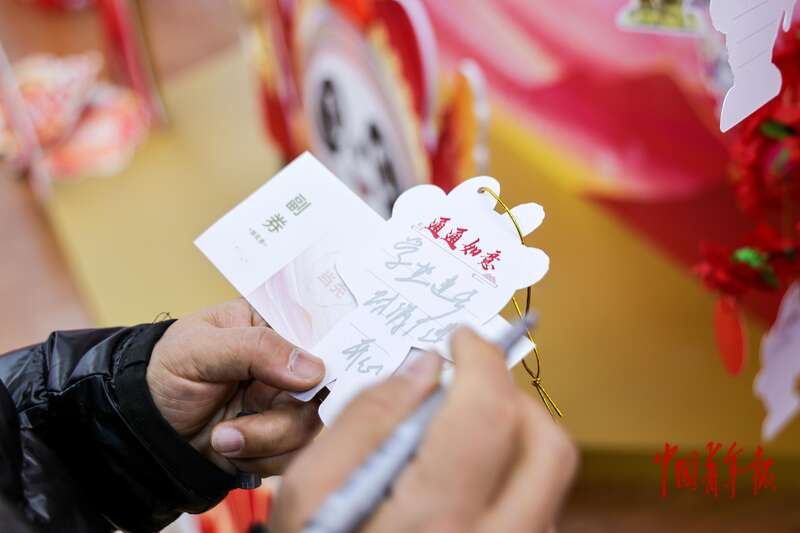 11月28日,北京,“马墩墩”首发当日,中国联通西单营业厅内设置了互动场景,一位观众在卡片上写下美好心愿。中青报·中青网记者 陈思阳/摄