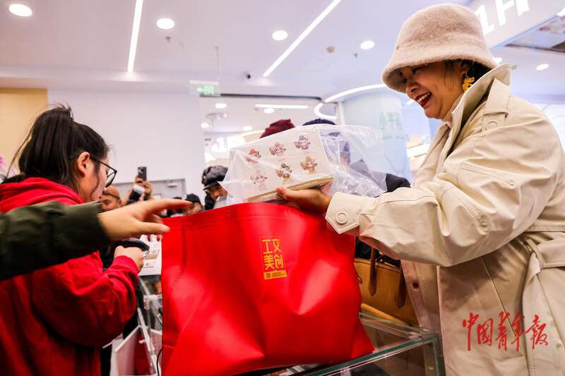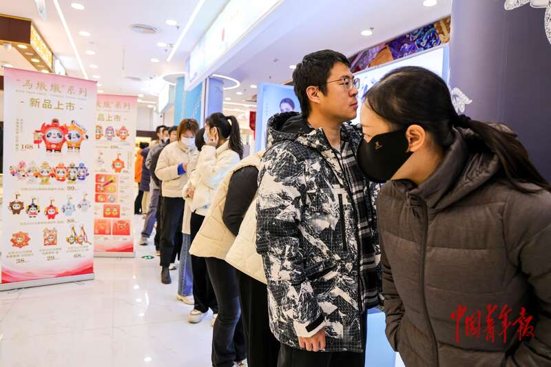 11月28日,北京王府井工美大厦,9:30开门后,消费者有序排队入场购买。首发当日共有毛绒、盲盒、钥匙扣、徽章、冰箱贴、帆布袋等约20款产品销售。中青报·中青网记者 陈思阳/摄
