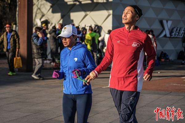 法国人米歇尔100多年前发明马拉松比赛时不会想到,一群看不清路的人跑进了赛道。只需要一根约30厘米的尼龙绳,两端都编上圆环,分别交给视障者和引跑志愿者,比赛就这么开始了。