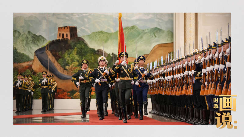 △马克龙在习近平陪同下检阅中国人民解放军仪仗队并观看分列式