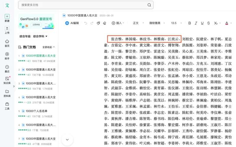 这两天,百度文库《10000中国普通人名大全》中“张吉惟、林国瑞、林玟书、林雅南、江奕云”五人的名字,被曝频繁出现在采购评审、比赛获奖名单、行政处罚公示等不同场景,引发舆论对公共事务造假的质疑,这五人也被称为“全网最忙五人组”。