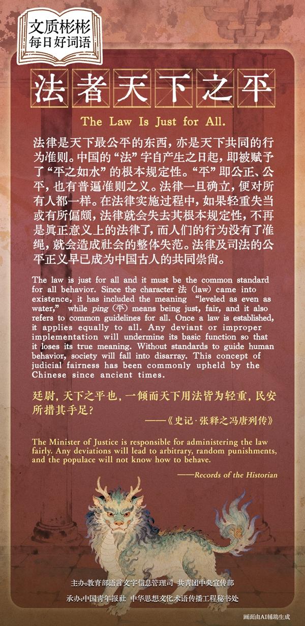 The law is just for all and it must be the common standard for all behavior. Since the character "法" (law) came into existence, it has included the meaning "leveled as even as water," while ping means being just, fair, and it also refers to common guidelines for all. Once a law is established, it applies equally to all. Any deviant or improper implementation will undermine its basic function so that it loses its true meaning. Without standards to guide human behavior, society will fall into disarray. This concept of judicial fairness has been commonly upheld by the Chinese since ancient times.