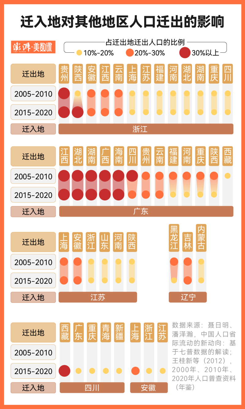 根据复旦大学人口研究所副教授潘泽瀚与上海金融与法律研究院研究员聂日明的研究,迁入省浙江、广东具有全国影响力。