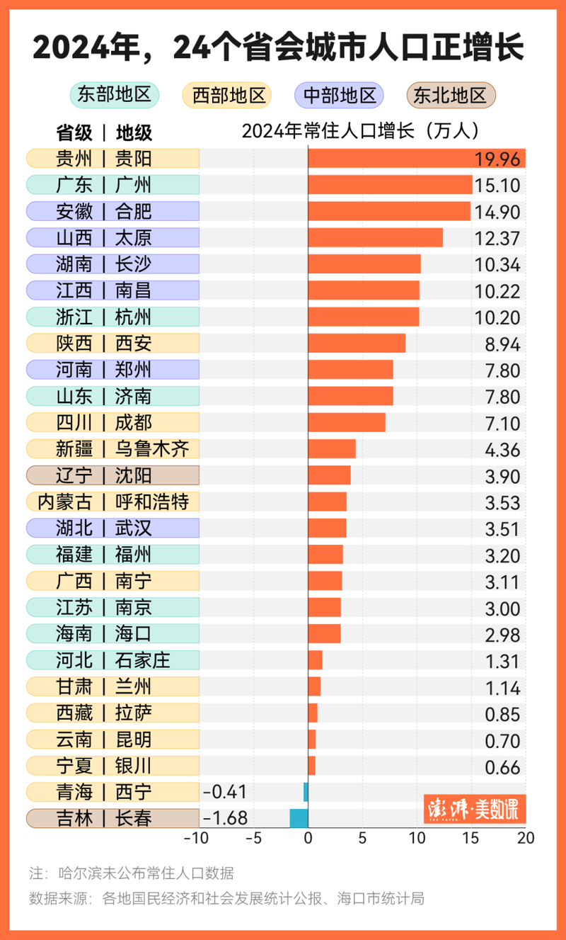 2024年,24个省会城市常住人口实现正增长,贵阳以19.96万新增人口一骑绝尘,广州、合肥增长量位居其后,太原、长沙、南昌等中西部省会也实现超10万人的强劲增长。
