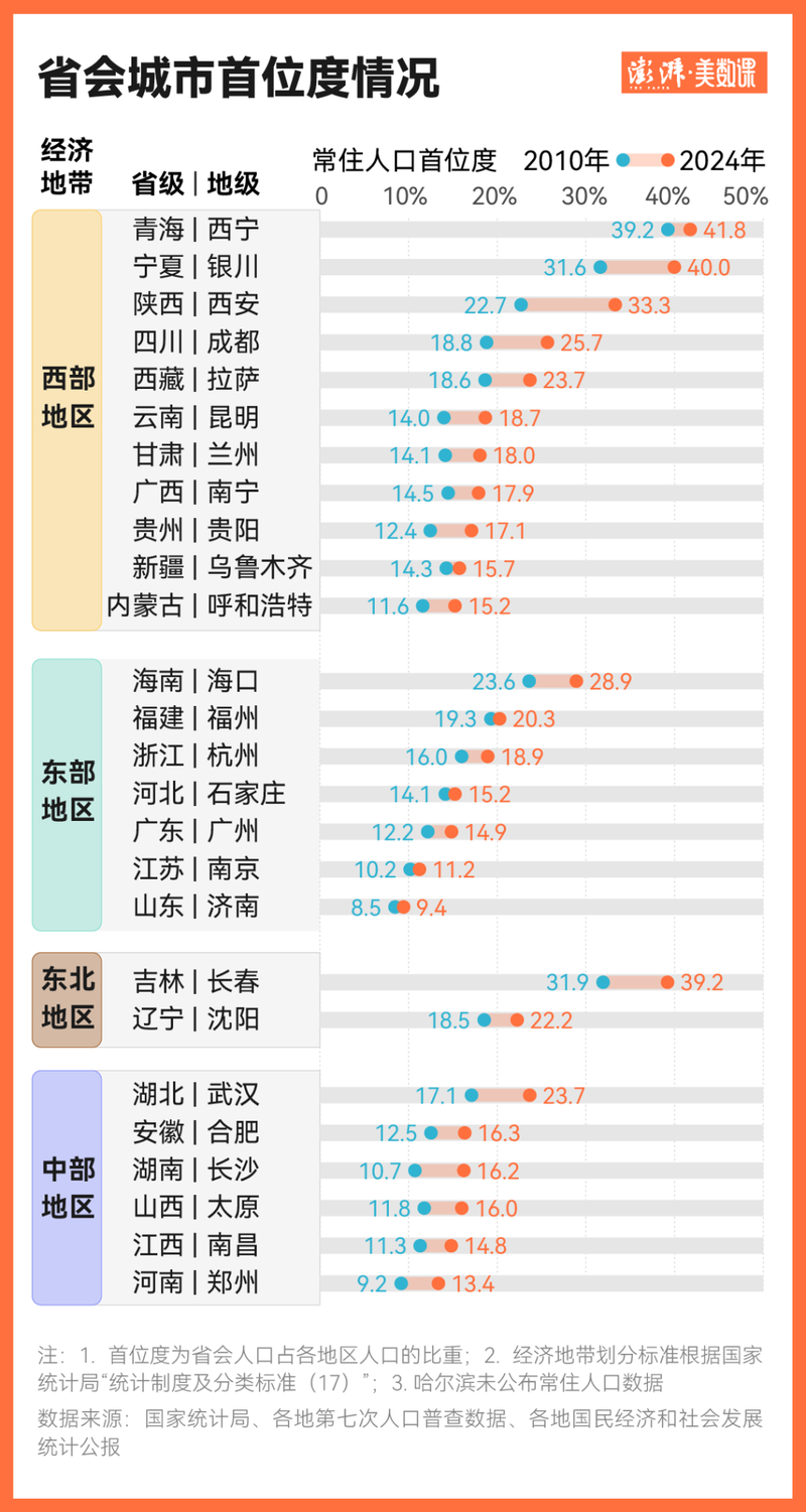 西部和东北省会首位度普遍较高且持续提升