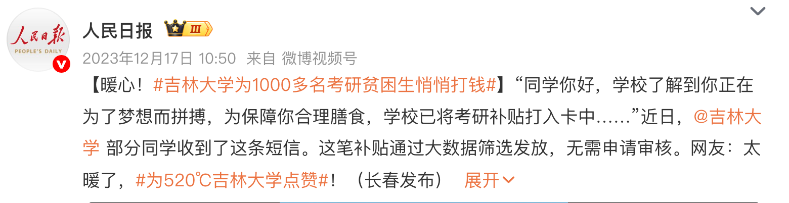 “今年我们一共向793名考研家庭经济困难学生发放了生活补助,累计发放37.76万元。”安徽师范大学学生工作处资助管理中心负责人金捷向透露,根据困难等级,每个学生可以收到额度不等的补贴,最少每人300元,最多每人650元。