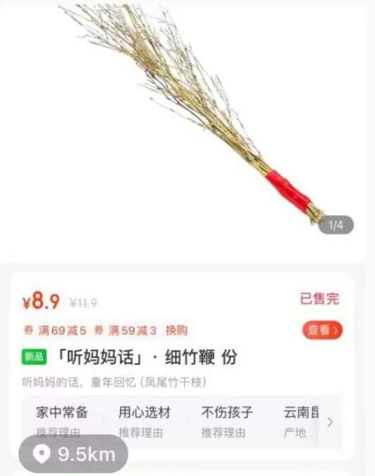 近日,有消费者发现某品牌线上超市小程序在售一款“听妈妈话”细竹鞭。记者发现,该商品名称下面大大方方写着:70—90代“童年回忆”,主打情绪价值,无不良引导。客服表示,该产品用于“和小孩沟通时”。商品评价里,也出现买回去“揍小朋友用的”说法。有律师表示:“可能变相鼓励家庭暴力。”