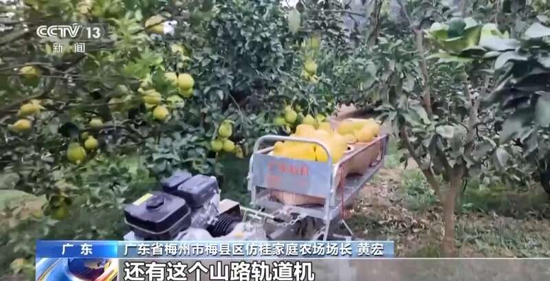 广东省梅州市梅县区仿桂家庭农场场长 黄宏:以前都是要人工从山上把柚子挑下来,现在有无人机,还有山路轨道机,效率提高了很多。