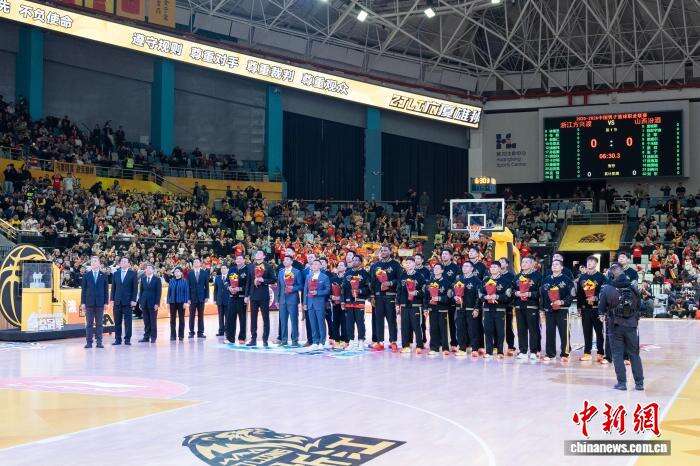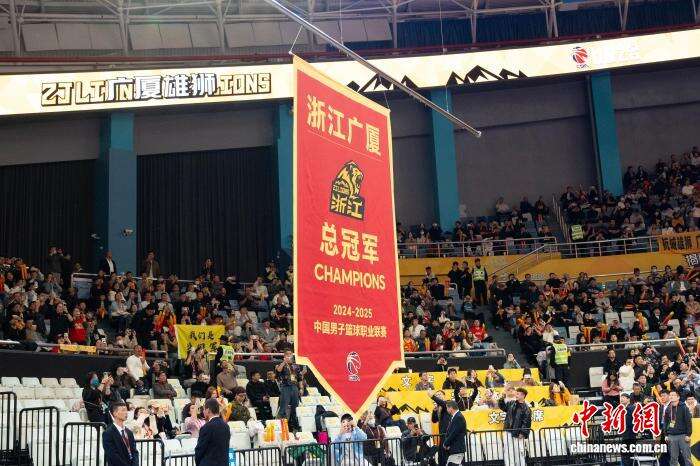 12月12日,浙江广厦男篮队史首面总冠军旗帜升起。当晚,2025—2026赛季中国男子篮球职业联赛(CBA)常规赛揭幕战在浙江杭州举行,赛前举行了上赛季颁奖仪式,浙江广厦男篮获得队史首面总冠军旗帜。中新社记者 吴君毅 摄