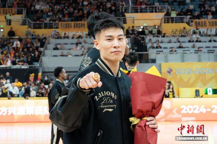 12月12日,来自台湾的球员林秉圣展示获得的上赛季总冠军戒指。当晚,2025—2026赛季中国男子篮球职业联赛(CBA)常规赛揭幕战在浙江杭州举行,赛前举行了上赛季颁奖仪式,浙江广厦男篮获得队史首面总冠军旗帜。中新社记者 吴君毅 摄