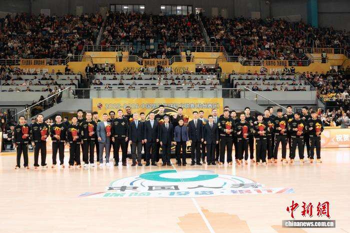 12月12日,浙江广厦男篮成员与颁奖嘉宾合影。当晚,2025—2026赛季中国男子篮球职业联赛(CBA)常规赛揭幕战在浙江杭州举行,赛前举行了上赛季颁奖仪式,浙江广厦男篮获得队史首面总冠军旗帜。中新社记者 吴君毅 摄