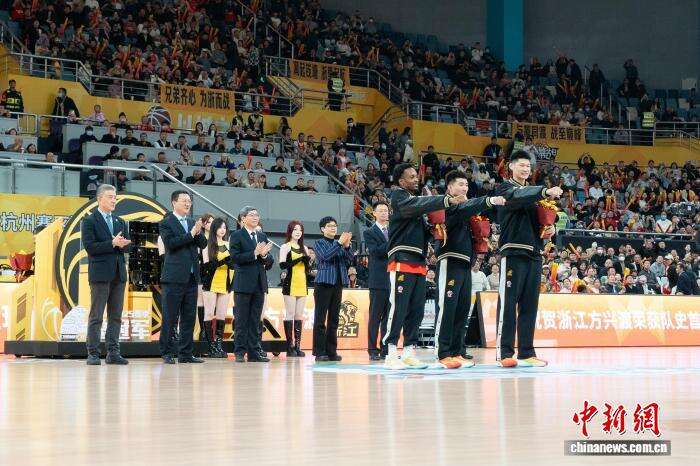 12月12日,浙江广厦男篮成员见证队史首面总冠军旗帜升起。当晚,2025—2026赛季中国男子篮球职业联赛(CBA)常规赛揭幕战在浙江杭州举行,赛前举行了上赛季颁奖仪式,浙江广厦男篮获得队史首面总冠军旗帜。中新社记者 吴君毅 摄