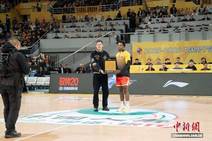 12月12日,2024—2025赛季CBA总决赛MVP得主巴里·布朗(右)展示个人手模。当晚,2025—2026赛季中国男子篮球职业联赛(CBA)常规赛揭幕战在浙江杭州举行,赛前举行了上赛季颁奖仪式,浙江广厦男篮获得队史首面总冠军旗帜。中新社记者 吴君毅 摄