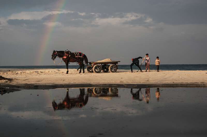 当地时间12月10日,加沙地带中部代尔巴拉赫,一名男子将沙子装上马车,一道彩虹出现在空中。视觉中国供图
